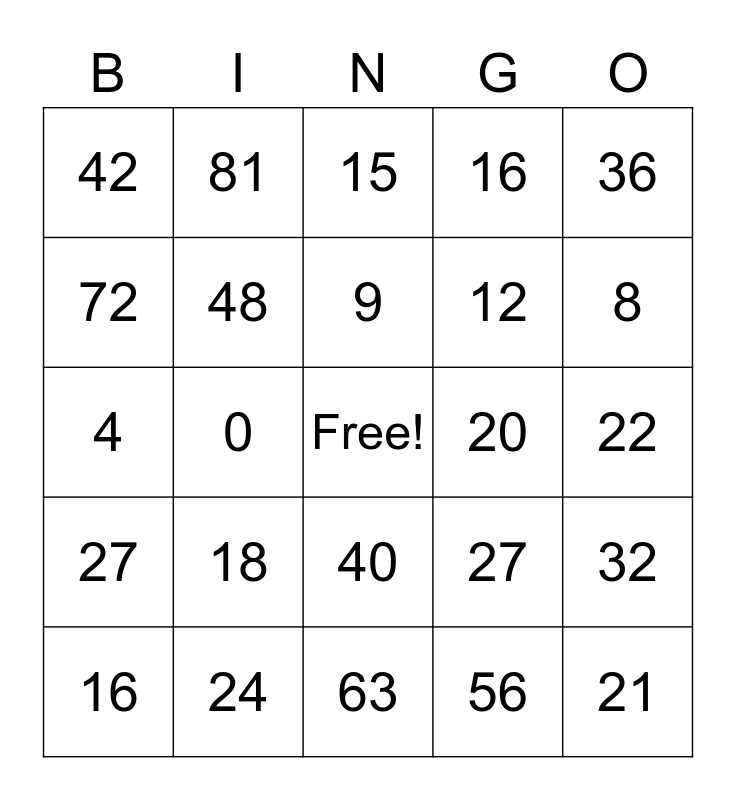 This bingo card has a free space and 24 words: 18, 24, 9, 16, 36, 42, 72, 81, 20, 40, 12, 4, 27, 32, 48, 56, 22, 15, 8, 0, 21, 27, 16 and 63.