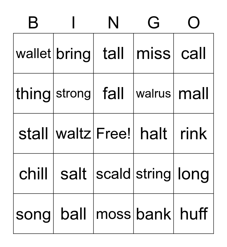 This bingo card has a free space and 24 words: salt, ball, fall, song, call, wallet, thing, bring, halt, scald, walrus, stall, string, long, strong, bank, rink, tall, mall, waltz, huff, chill, miss and moss.