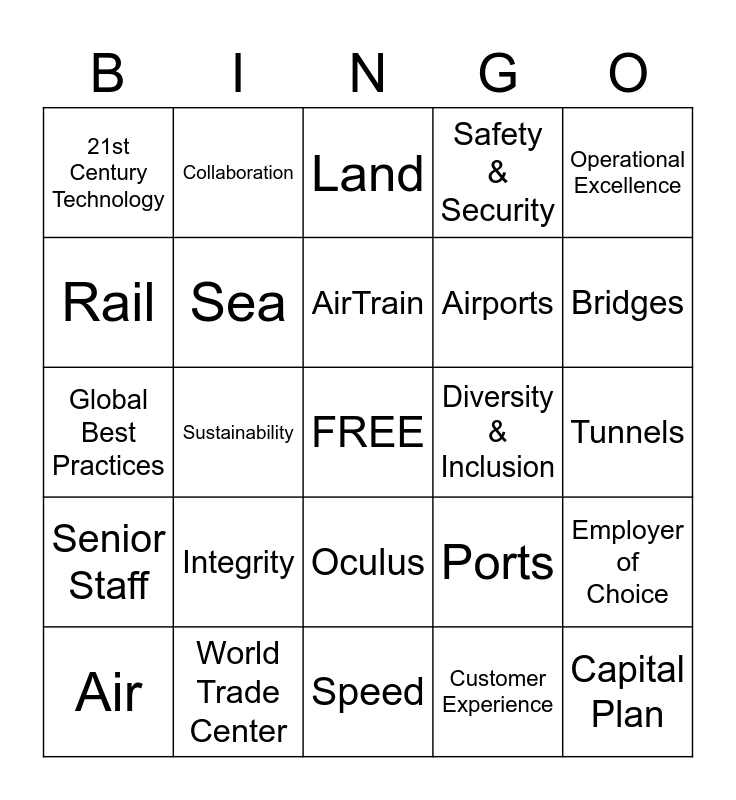 This bingo card has a free space and 24 words: Integrity, World Trade Center, AirTrain, Air, Operational Excellence, 21st Century Technology, Rail, Collaboration, Diversity & Inclusion, Oculus, Airports, Global Best Practices, Ports, Employer of Choice, Sea, Customer Experience, Tunnels, Land, Bridges, Sustainability, Capital Plan, Senior Staff, Safety & Security and Speed.