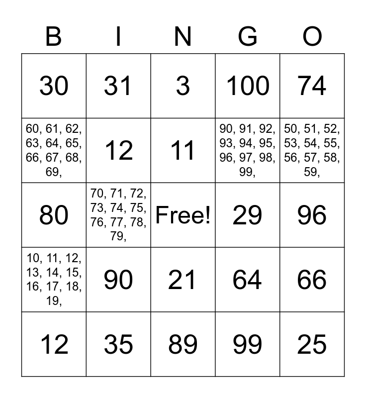 This bingo card has a free space and 44 words: 77, 90, 1, 99, 97, 81, 12, 53, 100, 25, 30, 35, 64, 96, 47, 9, 89, 29, 6, 80, 31, 21, 50, 74, 6, 9, 11, 99, 66, 12, 35, 3, 3, 4, 10, 11, 12, 13, 14, 15, 16, 17, 18, 19,, 20, 21, 22, 23, 24, 25, 26, 27, 28, 29,, 30, 31, 32, 33, 34, 35, 36, 37, 38, 39,, 40, 41, 42, 43, 44, 45, 46, 47, 48, 49,, 50, 51, 52, 53, 54, 55, 56, 57, 58, 59,, 60, 61, 62, 63, 64, 65, 66, 67, 68, 69,, 70, 71, 72, 73, 74, 75, 76, 77, 78, 79,, 80, 81, 82, 83, 84, 85, 86, 87, 88, 89,, 90, 91, 92, 93, 94, 95, 96, 97, 98, 99, and 100..