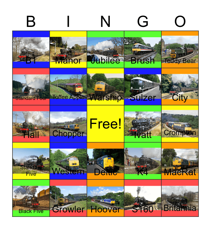 This bingo card has 24 images, a free space and 24 words: Western, Growler, Warship, Black Five, Teddy Bear, B1, Standard Four, Manor, Ivatt, Deltic, Sulzer, Hall, K4, MacRat, Toffee Apple, S160, Crompton, Jubilee, City, Chopper, Britannia, Standard Five, Brush and Hoover.