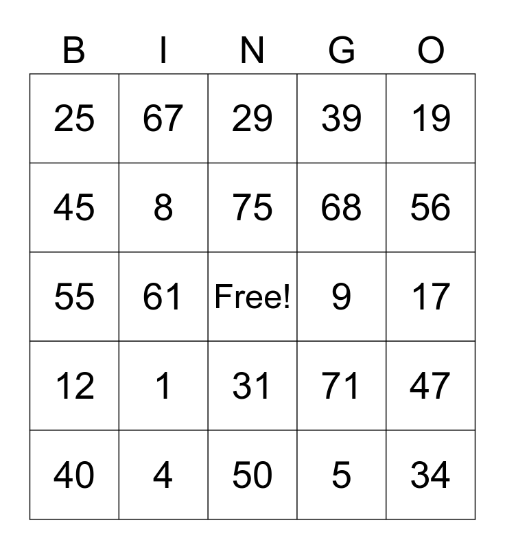 This bingo card has a free space and 24 words: 1, 4, 75, 40, 19, 25, 45, 67, 9, 31, 68, 55, 71, 47, 8, 5, 17, 29, 56, 61, 34, 12, 39 and 50.