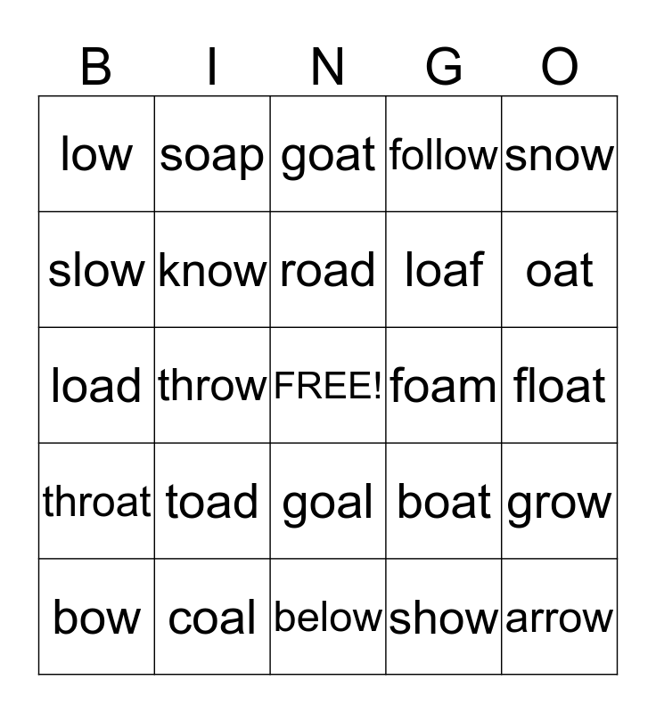 This bingo card has a free space and 24 words: toad, coal, road, bow, snow, low, slow, soap, foam, goal, loaf, load, boat, grow, know, show, float, goat, oat, throw, arrow, throat, follow and below.