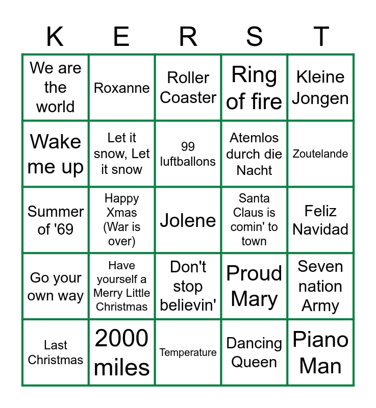 This bingo card has a free space and 29 words: Last Christmas, Driving Home for Christmas, Happy Xmas (War is over), Rocking Around the Chrismtmas Tree, We are the world, Roller Coaster, Let it snow, Let it snow, Have yourself a Merry Little Christmas, Santa Claus is comin' to town, 2000 miles, Feliz Navidad, Piano Man, Temperature, Dancing Queen, Zoutelande, Even aan mijn moeder vragen, Don't stop believin', Go your own way, Kleine Jongen, Summer of '69, Proud Mary, Sterrenstof, Atemlos durch die Nacht, Wake me up, Ring of fire, Roxanne, Seven nation Army, 99 luftballons and Limburg.