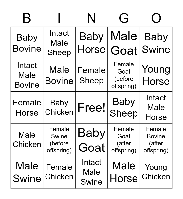 This bingo card has a free space and 25 words: Female Swine (before offspring), Intact Male Swine, Female Sheep, Male Swine, Baby Swine, Baby Bovine, Intact Male Bovine, Intact Male Sheep, Baby Sheep, Baby Goat, Female Goat (before offspring), Female Horse, Female Goat (after offspring), Female Bovine (after offspring), Male Bovine, Male Sheep, Intact Male Horse, Baby Horse, Young Horse, Baby Chicken, Young Chicken, Female Chicken, Male Chicken, Male Goat and Male Horse.