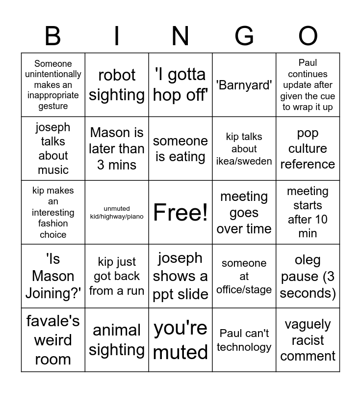 This bingo card has a free space and 26 words: joseph shows a ppt slide, Paul can't technology, someone is eating, animal sighting, Paul continues update after given the cue to wrap it up, Someone unintentionally makes an inappropriate gesture, joseph talks about music, robot sighting, meeting starts after 10 min, someone at office/stage, kip talks about ikea/sweden, kip makes an interesting fashion choice, oleg pause (3 seconds), favale's weird room, unmuted kid/highway/piano, awful pun, 'Barnyard', 'Is Mason Joining?', 'I gotta hop off', vaguely racist comment, pop culture reference, you're muted, meeting goes over time, kip just got back from a run, Mason is later than 3 mins and Someone is eating.