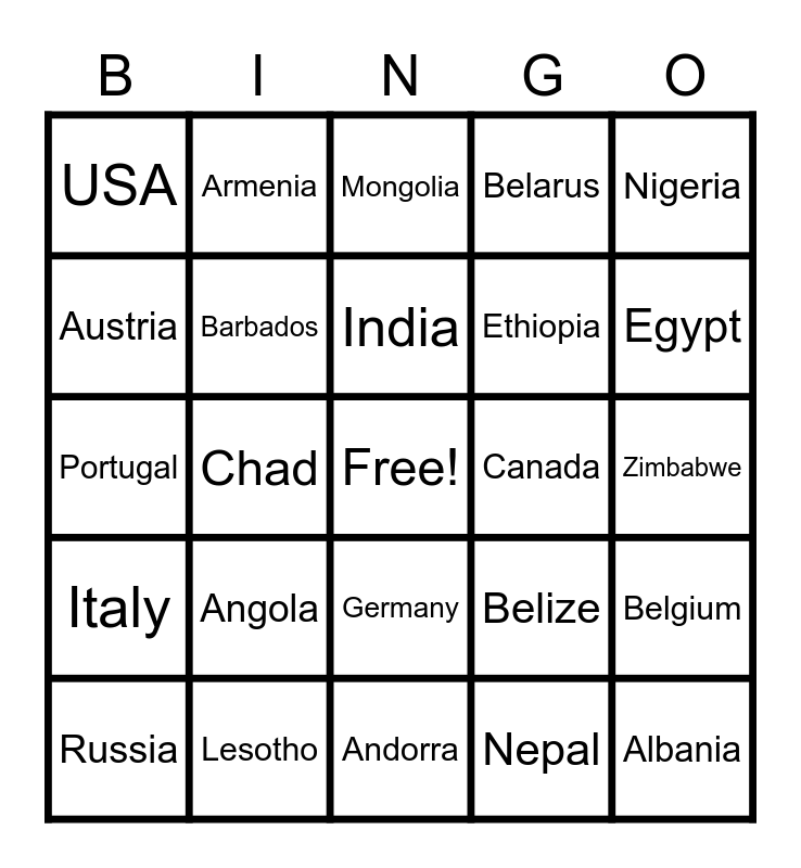 This bingo card has a free space and 49 words: Afghanistan, Albania, Algeria, Andorra, Angola, Argentina, Armenia, Australia, Austria, Bangladesh, Barbados, Belarus, Belgium, Belize, Bhutan, Brazil, India, Canada, Cameroon, Nigeria, Chad, Nepal, USA, Ethiopia, Mexico, Egypt, Russia, UK, Germany, Italy, Japan, Indonesia, Israel, Kosovo, Lesotho, Switzerland, Pakistan, Vatican City, Zimbabwe, Yemen, Thailand, Somalia, Burkina Faso, Peru, Portugal, Mongolia, Greece, France and Eritrea.