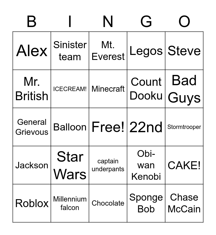 This bingo card has a free space and 24 words: Star Wars, Millennium falcon, Minecraft, Roblox, Steve, Alex, Mr. British, Sinister team, 22nd, captain underpants, Count Dooku, General Grievous, Obi-wan Kenobi, CAKE!, ICECREAM!, Sponge Bob, Stormtrooper, Mt. Everest, Bad Guys, Balloon, Chase McCain, Jackson, Legos and Chocolate.