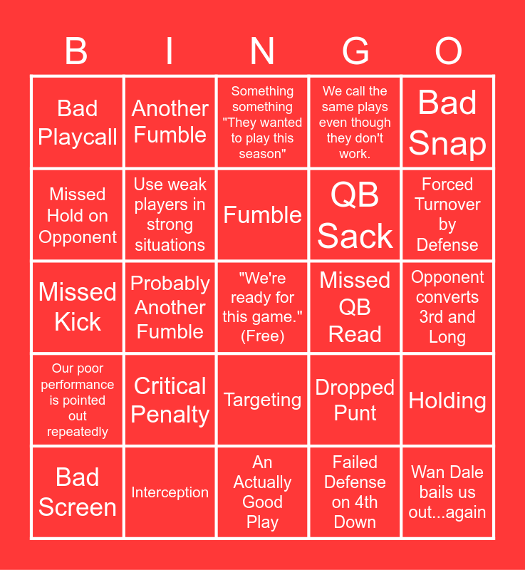 This bingo card has a free space and 24 words: Critical Penalty, Interception, Fumble, Bad Screen, Bad Snap, Bad Playcall, Missed Hold on Opponent, Another Fumble, Missed QB Read, Targeting, QB Sack, Missed Kick, Dropped Punt, Holding, Use weak players in strong situations, Failed Defense on 4th Down, Opponent converts 3rd and Long, Something something "They wanted to play this season", Forced Turnover by Defense, Probably Another Fumble, Wan Dale bails us out...again, Our poor performance is pointed out repeatedly, We call the same plays even though they don't work. and An Actually Good Play.