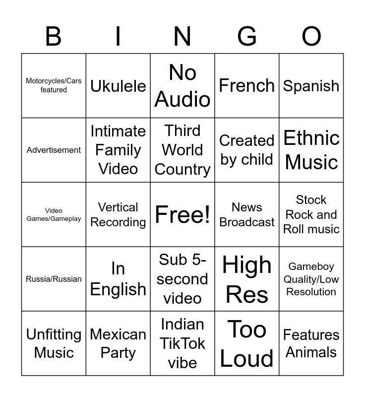 This bingo card has a free space and 25 words: In English, Indian TikTok vibe, Third World Country, Unfitting Music, Spanish, Motorcycles/Cars featured, Advertisement, Ukulele, News Broadcast, Sub 5-second video, Created by child, Video Games/Gameplay, High Res, Gameboy Quality/Low Resolution, Intimate Family Video, Weird Intro/Outro, Stock Rock and Roll music, No Audio, Ethnic Music, Vertical Recording, Features Animals, Mexican Party, Russia/Russian, French and Too Loud.
