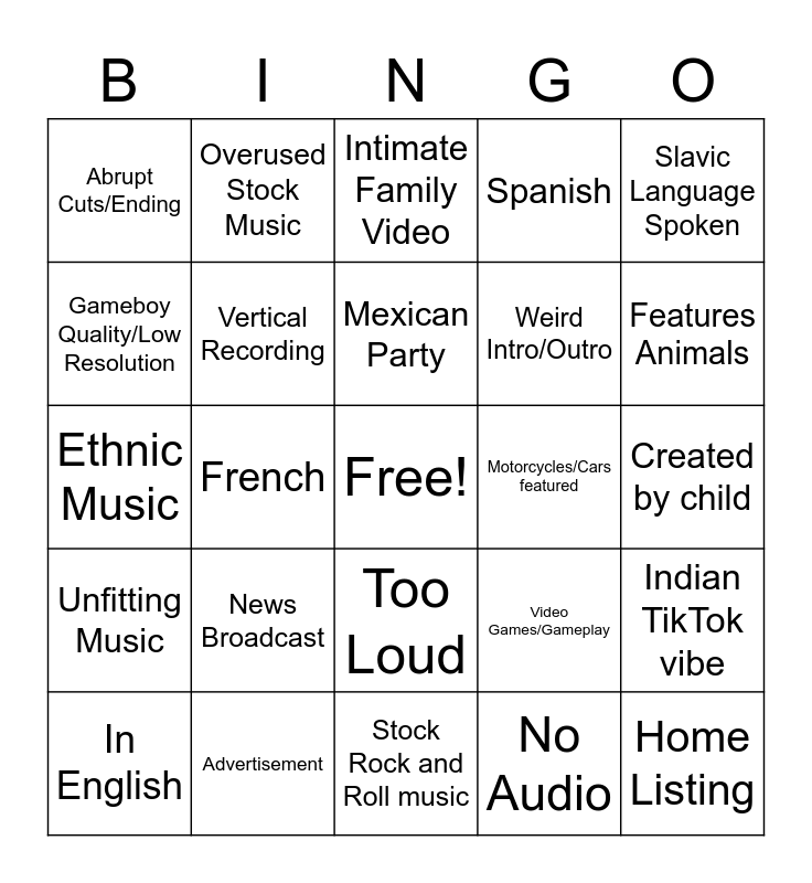 This bingo card has a free space and 25 words: News Broadcast, Stock Rock and Roll music, Mexican Party, In English, Slavic Language Spoken, Abrupt Cuts/Ending, Gameboy Quality/Low Resolution, Overused Stock Music, Motorcycles/Cars featured, Too Loud, Weird Intro/Outro, Ethnic Music, Video Games/Gameplay, Indian TikTok vibe, Vertical Recording, Sub 5-second video, Created by child, Intimate Family Video, Features Animals, French, Home Listing, Advertisement, Unfitting Music, Spanish and No Audio.