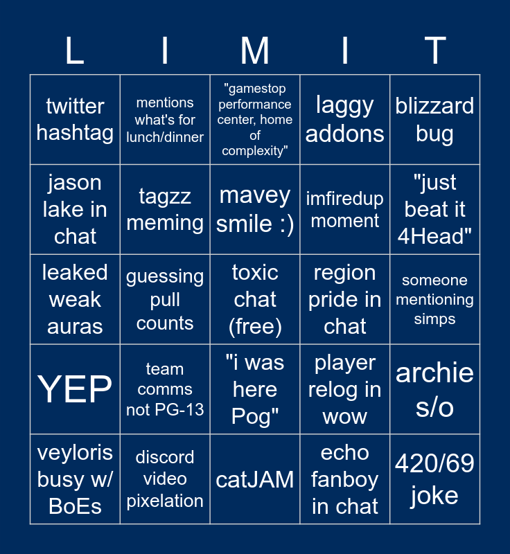 This bingo card has a free space and 24 words: team comms not PG-13, discord video pixelation, mavey smile :), veyloris busy w/ BoEs, blizzard bug, twitter hashtag, jason lake in chat, mentions what's for lunch/dinner, region pride in chat, "i was here Pog", imfiredup moment, leaked weak auras, player relog in wow, archie s/o, tagzz meming, echo fanboy in chat, someone mentioning simps, "gamestop performance center, home of complexity", "just beat it 4Head", guessing pull counts, 420/69 joke, YEP, laggy addons and catJAM.