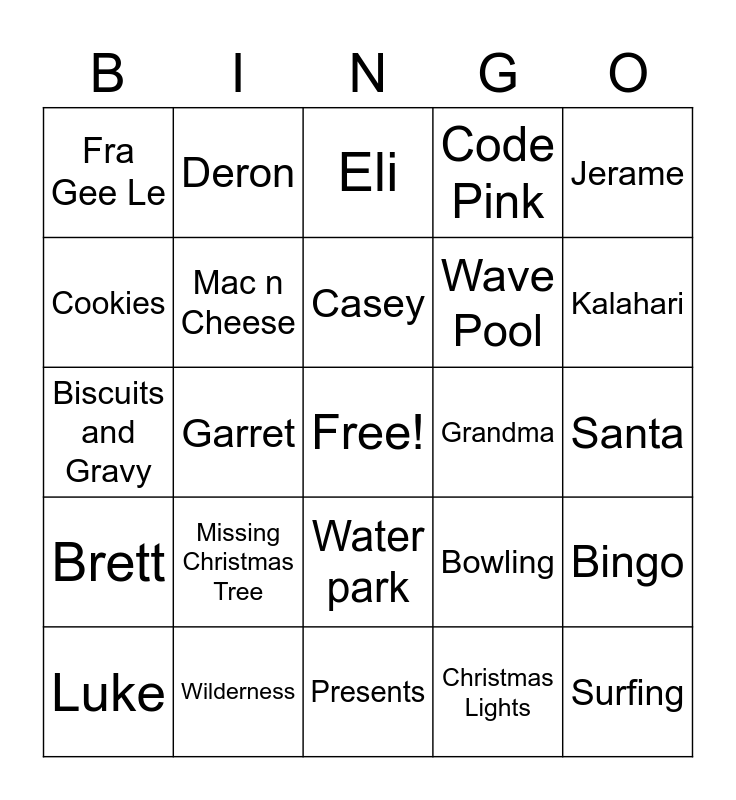 This bingo card has a free space and 33 words: Allen, April, Garret, Sam, Brett, Mac n Cheese, Jerame, Luke, Deron, Emilie, Casey, Eli, WI Dells, Pops, Grandma, Kalahari, Wilderness, Biscuits and Gravy, Missing Christmas Tree, Bowling, Water park, Hot Tub, Fra Gee Le, Santa, Presents, Surfing, Code Pink, Wave Pool, Cookies, Bingo, Candy Cane, Christmas Lights and Mackenzie.