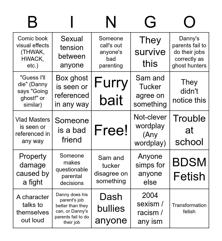 This bingo card has a free space and 25 words: Someone makes questionable parental decisions, Dash bullies anyone, Furry bait, A character talks to themselves out loud, Danny's parents fail to do their jobs correctly as ghost hunters, Comic book visual effects (THWAK, HWACK, etc.), "Guess I'll die" (Danny says "Going ghost!" or similar), Sexual tension between anyone, Not-clever wordplay (Any wordplay), Sam and tucker disagree on something, Sam and Tucker agree on something, Vlad Masters is seen or referenced in any way, Anyone simps for anyone else, BDSM Fetish, Box ghost is seen or referenced in any way, Danny transforms more than once in a single scene, Trouble at school, Someone call's out anyone's bad parenting, They didn't notice this, Someone is a bad friend, Transformation fetish, Danny does his parent's job better than they can, or Danny's parents fail to do their job, Property damage caused by a fight, They survive this and 2004 sexism / racism / any ism.