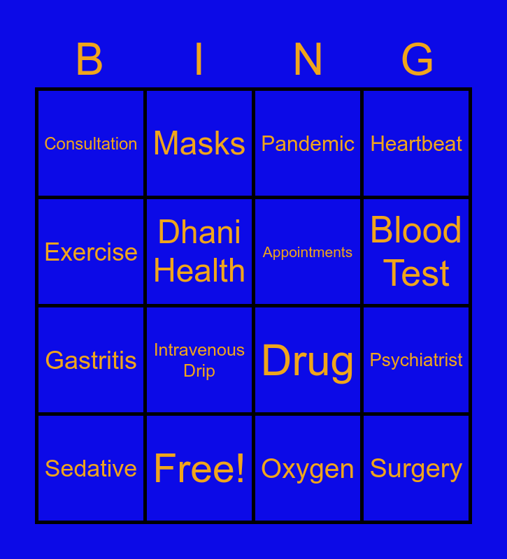This bingo card has 22 words: Free!, PPE Suit, Masks, Syringe, Dhani Health, Appointments, Consultation, Pandemic, Drug, Surgery, Gastritis, Heartbeat, Blood Pressure, MRI, Oxygen, Vaccine, Psychiatrist, Sedative, Intravenous Drip, Exercise, Blood Test and Sonography.