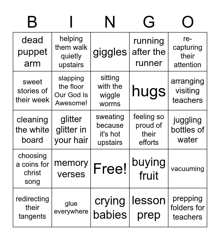 This bingo card has 26 words: Free!, lesson prep, sitting with the wiggle worms, glue everywhere, re-capturing their attention, dead puppet arm, sweet stories of their week, helping them walk quietly upstairs, juggling bottles of water, buying fruit, hugs, cleaning the white board, vacuuming, redirecting their tangents, glitter glitter in your hair, stopping an argument, running after the runner, choosing a coins for christ song, giggles, sweating because it's hot upstairs, arranging visiting teachers, crying babies, feeling so proud of their efforts, memory verses, slapping the floor Our God Is Awesome! and prepping folders for teachers.
