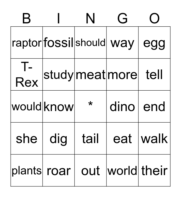 This bingo card has a free space and 24 words: dig, roar, meat, plants, egg, raptor, T-Rex, fossil, dino, tail, more, would, eat, walk, study, world, end, should, tell, know, their, she, way and out.