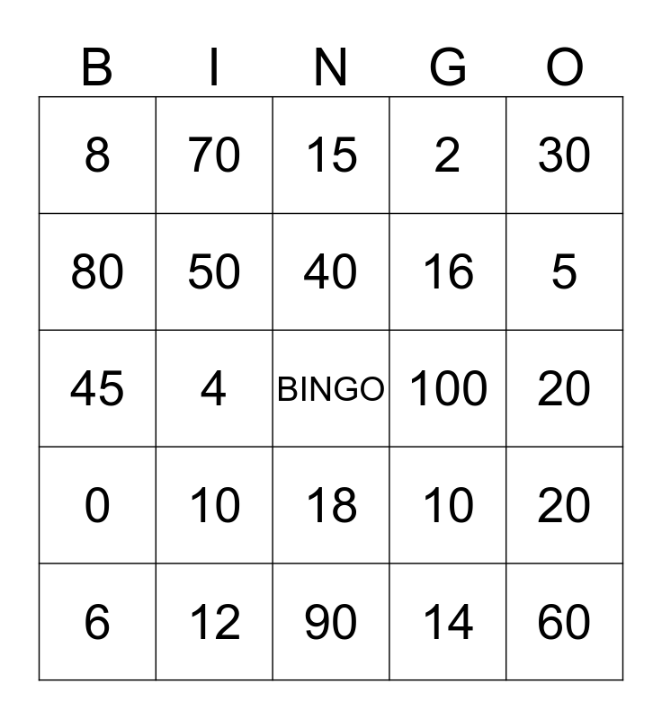 This bingo card has a free space and 24 words: 10, 12, 40, 6, 30, 8, 80, 70, 100, 18, 16, 45, 10, 20, 50, 14, 20, 15, 5, 4, 60, 0, 2 and 90.