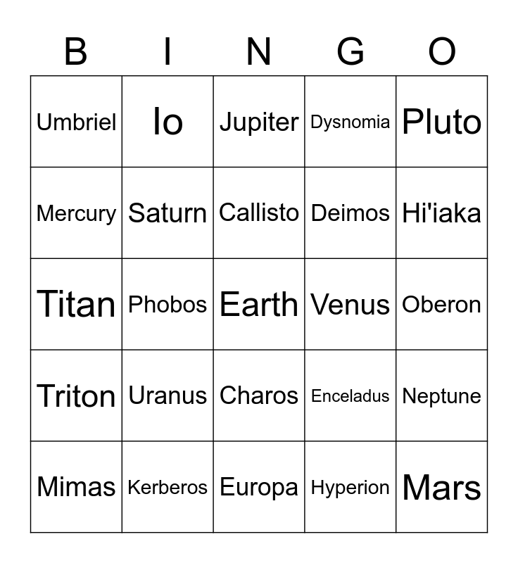 This bingo card has a free space and 24 words: Uranus, Kerberos, Callisto, Mimas, Pluto, Umbriel, Mercury, Io, Venus, Charos, Deimos, Titan, Enceladus, Neptune, Saturn, Hyperion, Oberon, Jupiter, Hi'iaka, Phobos, Mars, Triton, Dysnomia and Europa.