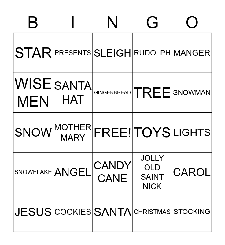 This bingo card has a free space and 24 words: ANGEL, COOKIES, GINGERBREAD, JESUS, MANGER, STAR, WISE MEN, PRESENTS, TOYS, CANDY CANE, TREE, SNOW, JOLLY OLD SAINT NICK, CAROL, SANTA HAT, CHRISTMAS, LIGHTS, SLEIGH, SNOWMAN, MOTHER MARY, STOCKING, SNOWFLAKE, RUDOLPH and SANTA.