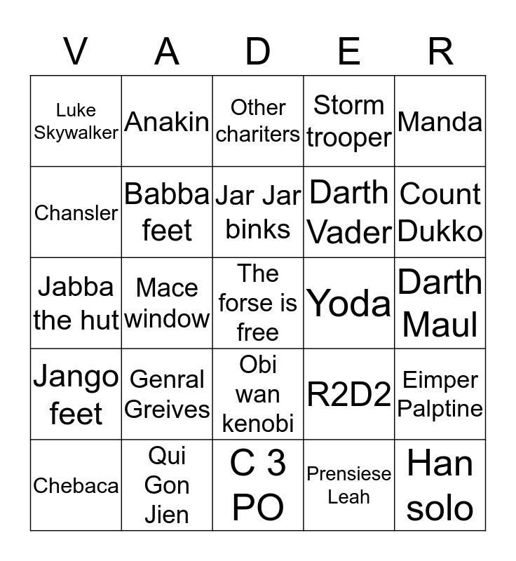 This bingo card has a free space and 24 words: Genral Greives, Qui Gon Jien, Jar Jar binks, Chebaca, Manda, Luke Skywalker, Chansler, Anakin, Yoda, Obi wan kenobi, Darth Vader, Jabba the hut, R2D2, Eimper Palptine, Babba feet, Prensiese Leah, Darth Maul, Other chariters, Count Dukko, Mace window, Han solo, Jango feet, Storm trooper and C 3 PO.