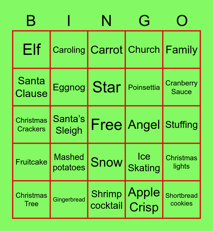 This bingo card has a free space and 29 words: Christmas Tree, Smile, Santa’s Sleigh, Reindeer, Elf, Carrot, Eggnog, Mashed potatoes, Angel, Gingerbread, Stuffing, Shortbread cookies, Shrimp cocktail, Apple Crisp, Cranberry Sauce, Present, Snow, Fruitcake, Family, Christmas Crackers, Ice Skating, Sledding, Poinsettia, Santa Clause, Church, Caroling, Christmas lights, Star and Snowman.