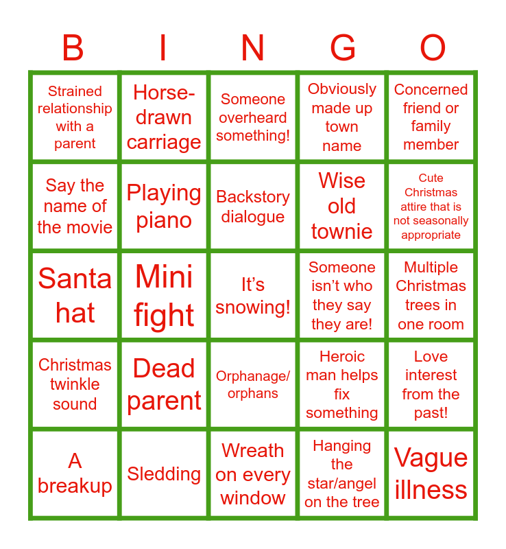 This bingo card has 30 words: Sledding, Quirky kid, Mini fight, Guy teaches girl to do something by standing behind her, Strained relationship with a parent, Someone overheard something!, Playing piano, Orphanage/ orphans, Someone isn’t who they say they are!, Wreath on every window, Multiple Christmas trees in one room, It’s snowing!, Hanging the star/angel on the tree, Vague illness, Cute Christmas attire that is not seasonally appropriate, Character has a signature quirky accessory, Heroic man helps fix something, Christmas twinkle sound, Dead parent, Concerned friend or family member, Santa hat, White Christmas, Horse-drawn carriage, Wise old townie, Say the name of the movie, Obviously made up town name, Love interest from the past!, A breakup, Backstory dialogue and Quaint town.