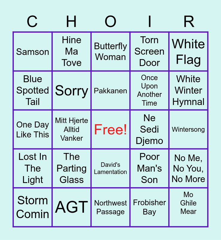 This bingo card has a free space and 34 words: Call Your Girlfriend, Frobisher Bay, And So It Goes, Drunken Sailor, Lost In The Light, Sorry, White Flag, Storm Comin, Hine Ma Tove, Ivory Tongue, Pakkanen, Butterfly Woman, River, Koudjay, Ne Sedi Djemo, White Winter Hymnal, AGT, One Day Like This, The Parting Glass, Poor Man's Son, David's Lamentation, Kalinda, Samson, Wintersong, Northwest Passage, Mo Ghile Mear, Torn Screen Door, Carol of the Bells, Once Upon Another Time, Blue Spotted Tail, Over The Rainbow, Mitt Hjerte Alltid Vanker, No Me, No You, No More and Comfortable with the Silence.