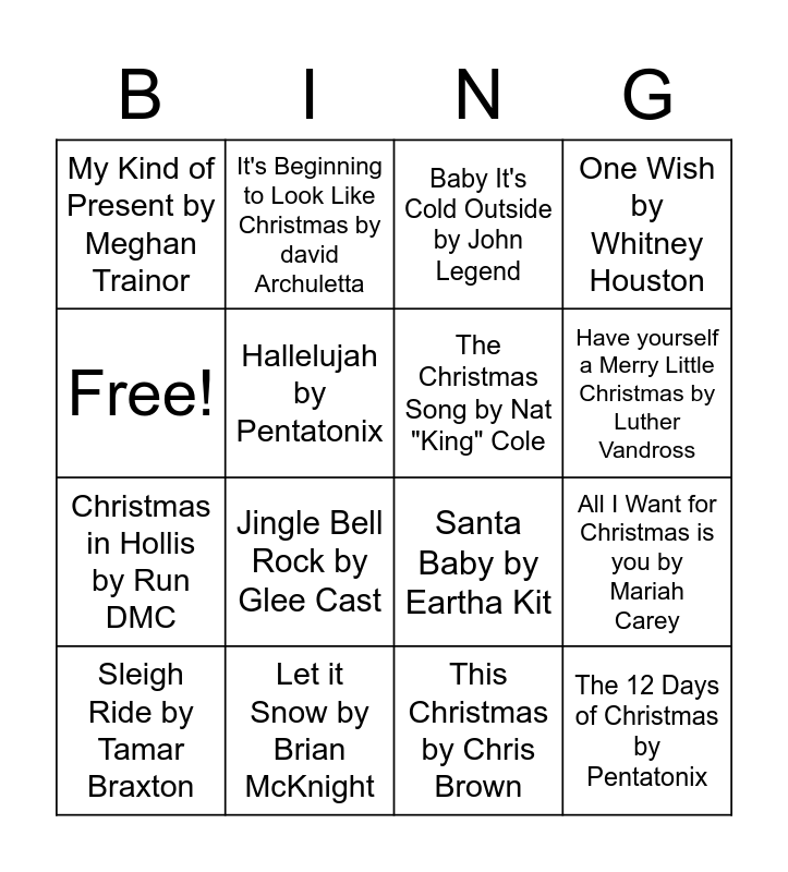 This bingo card has 16 words: Let it Snow by Brian McKnight, All I Want for Christmas is you by Mariah Carey, Baby It's Cold Outside by John Legend, My Kind of Present by Meghan Trainor, Christmas in Hollis by Run DMC, It's Beginning to Look Like Christmas by david Archuletta, Santa Baby by Eartha Kit, This Christmas by Chris Brown, Free!, Hallelujah by Pentatonix, Sleigh Ride by Tamar Braxton, One Wish by Whitney Houston, Jingle Bell Rock by Glee Cast, Have yourself a Merry Little Christmas by Luther Vandross, The Christmas Song by Nat "King" Cole and The 12 Days of Christmas by Pentatonix.