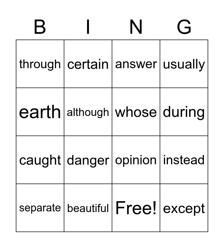 This bingo card has 16 words: beautiful, instead, answer, through, caught, certain, opinion, Free!, earth, although, separate, usually, danger, during, whose and except.
