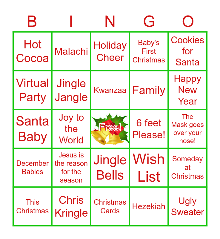 This bingo card has a free space and 39 words: ELF, Covid Christmas, Comfort & Joy, Jingle Jangle, This Christmas, Jingle Bells, Kwanzaa, Christmas Tree, Cookies for Santa, December Babies, Joy to the World, Baby's First Christmas, Ugly Sweater, The Mask goes over your nose!, 6 feet Please!, Jesus is the reason for the season, Secret Santa, Hot Cocoa, Money Jar, Wish List, Virtual Party, Christmas Cards, Family, Happy New Year, Hosanna, Dominique Devereaux, Zoe, Amir, Sameer, Malachi, Solomon, Azai, Holiday Cheer, Chris Kringle, Hezekiah, Merry Christmas Baby, Someday at Christmas, Santa Baby and Home made Cookies.