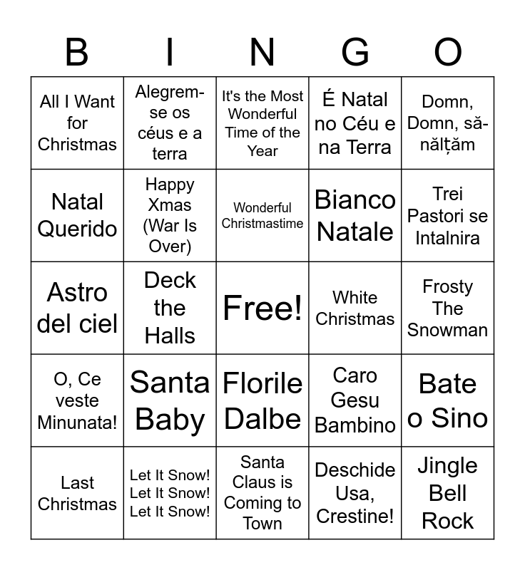 This bingo card has a free space and 29 words: Last Christmas, Rudolph The Red Nosed Reindeer, Deck the Halls, It's Beginning To Look A Lot Like Christmas, All I Want for Christmas, It's the Most Wonderful Time of the Year, Happy Xmas (War Is Over), Santa Baby, White Christmas, Let It Snow! Let It Snow! Let It Snow!, Frosty The Snowman, Jingle Bell Rock, Santa Claus is Coming to Town, Deschide Usa, Crestine!, Trei Pastori se Intalnira, Afara Ninge Linistit, Florile Dalbe, O, Ce veste Minunata!, Domn, Domn, să-nălțăm, Astro del ciel, Caro Gesu Bambino, Tu scendi dalle stele, Bianco Natale, Natal Querido, É Natal no Céu e na Terra, Alegrem-se os céus e a terra, Bate o Sino, Wonderful Christmastime and Vive le Vent.