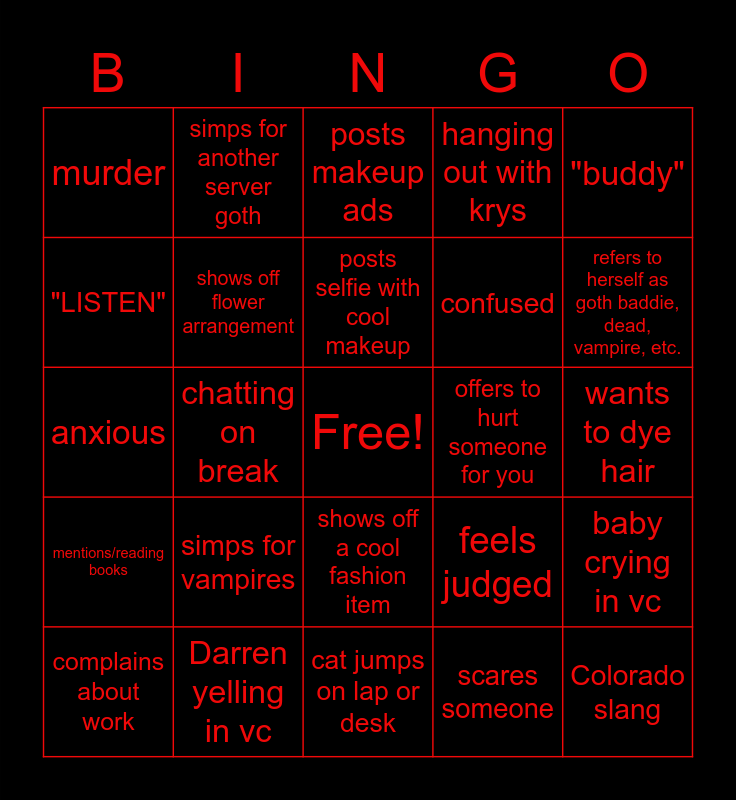 This bingo card has a free space and 24 words: simps for vampires, Darren yelling in vc, posts selfie with cool makeup, complains about work, "buddy", murder, "LISTEN", simps for another server goth, offers to hurt someone for you, shows off a cool fashion item, confused, anxious, feels judged, baby crying in vc, shows off flower arrangement, scares someone, wants to dye hair, posts makeup ads, refers to herself as goth baddie, dead, vampire, etc., chatting on break, Colorado slang, mentions/reading books, hanging out with krys and cat jumps on lap or desk.