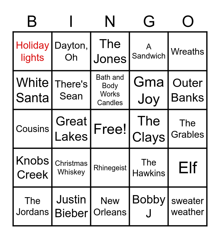 This bingo card has a free space and 24 words: Christmas Whiskey, Justin Bieber, Bath and Body Works Candles, The Jordans, Wreaths, Holiday lights, White Santa, Dayton, Oh, The Clays, Rhinegeist, Gma Joy, Cousins, The Hawkins, Elf, There's Sean, Bobby J, The Grables, The Jones, Outer Banks, Great Lakes, sweater weather, Knobs Creek, A Sandwich and New Orleans.