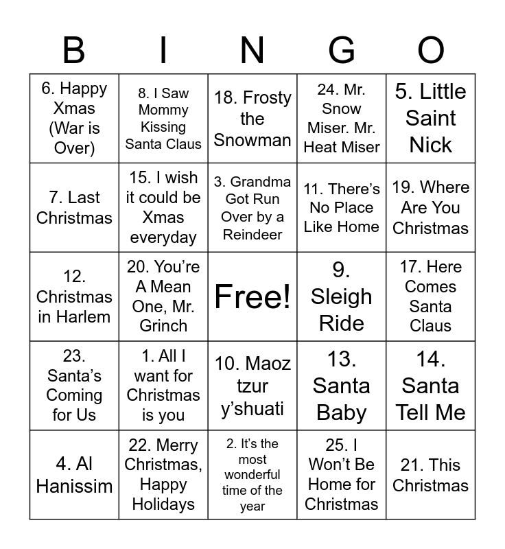This bingo card has a free space and 25 words: 1. All I want for Christmas is you, 2. It’s the most wonderful time of the year, 3. Grandma Got Run Over by a Reindeer, 4. Al Hanissim, 5. Little Saint Nick, 6. Happy Xmas (War is Over), 7. Last Christmas, 8. I Saw Mommy Kissing Santa Claus, 9. Sleigh Ride, 10. Maoz tzur y’shuati, 11. There’s No Place Like Home, 12. Christmas in Harlem, 13. Santa Baby, 14. Santa Tell Me, 15. I wish it could be Xmas everyday, 16. It’s Beginning to look a lot like Christmas, 17. Here Comes Santa Claus, 18. Frosty the Snowman, 19. Where Are You Christmas, 20. You’re A Mean One, Mr. Grinch, 21. This Christmas, 22. Merry Christmas, Happy Holidays, 23. Santa’s Coming for Us, 24. Mr. Snow Miser. Mr. Heat Miser and 25. I Won’t Be Home for Christmas.