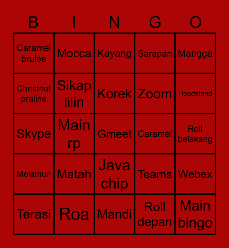 This bingo card has a free space and 24 words: Matah, Roa, Korek, Terasi, Mangga, Caramel brulee, Chestnut praline, Mocca, Caramel, Java chip, Zoom, Skype, Teams, Webex, Sikap lilin, Roll depan, Roll belakang, Kayang, Headstand, Main rp, Main bingo, Melamun, Sarapan and Mandi.