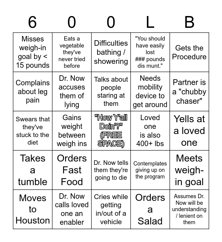 This bingo card has a free space and 24 words: Orders Fast Food, Dr. Now calls loved one an enabler, Talks about people staring at them, Moves to Houston, Gets the Procedure, Misses weigh-in goal by < 15 pounds, Complains about leg pain, Eats a vegetable they've never tried before, Loved one is also 400+ lbs, Dr. Now tells them they're going to die, Needs mobility device to get around, Swears that they've stuck to the diet, Contemplates giving up on the program, Meets weigh-in goal, Dr. Now accuses them of lying, Orders a Salad, Yells at a loved one, Difficulties bathing / showering, Partner is a "chubby chaser", Gains weight between weigh ins, Assumes Dr. Now will be understanding / lenient on them, Takes a tumble, "You should have easily lost ### pounds dis munt." and Cries while getting in/out of a vehicle.