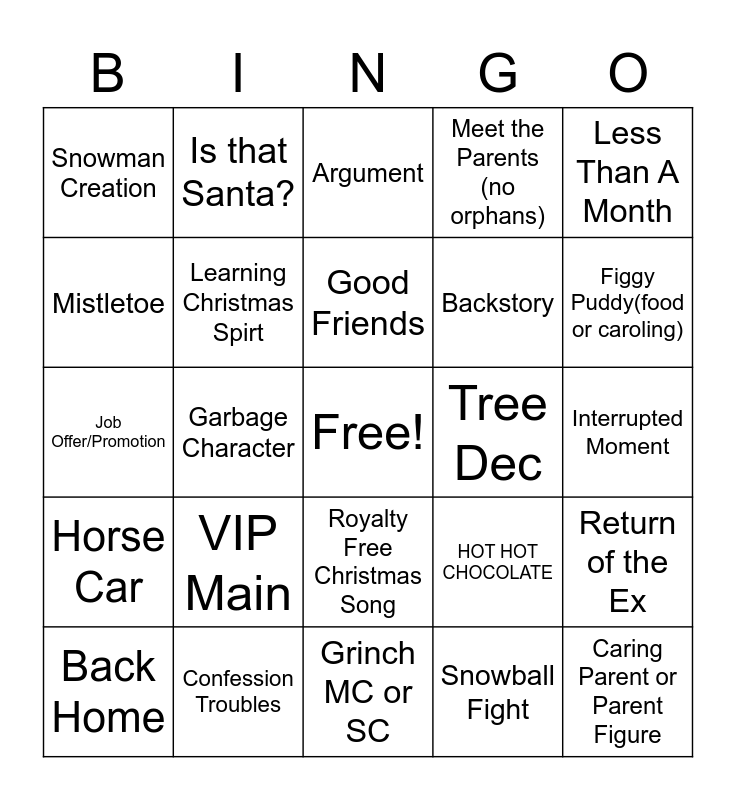 This bingo card has a free space and 24 words: VIP Main, Confession Troubles, Good Friends, Back Home, Less Than A Month, Snowman Creation, Mistletoe, Is that Santa?, Tree Dec, Royalty Free Christmas Song, Backstory, Job Offer/Promotion, HOT HOT CHOCOLATE, Return of the Ex, Learning Christmas Spirt, Snowball Fight, Interrupted Moment, Argument, Figgy Puddy(food or caroling), Garbage Character, Caring Parent or Parent Figure, Horse Car, Meet the Parents (no orphans) and Grinch MC or SC.