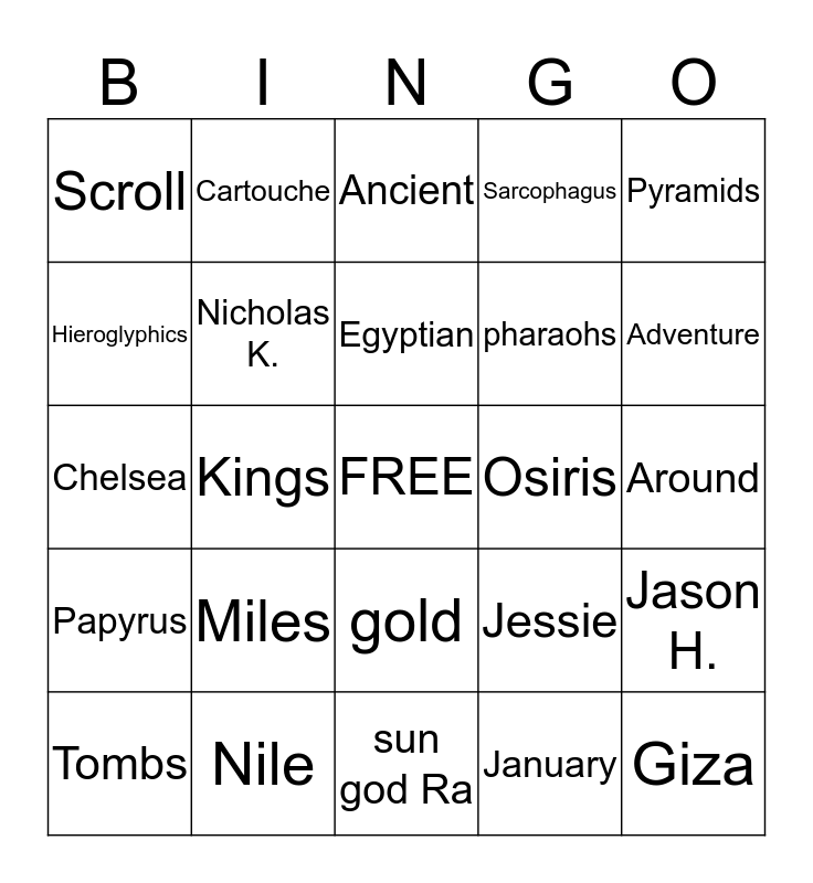 This bingo card has a free space and 24 words: Miles, Nile, Egyptian, Tombs, Pyramids, Scroll, Hieroglyphics, Cartouche, Osiris, gold, pharaohs, Chelsea, Jessie, Jason H., Nicholas K., January, Around, Ancient, Adventure, Kings, Giza, Papyrus, Sarcophagus and sun god Ra.