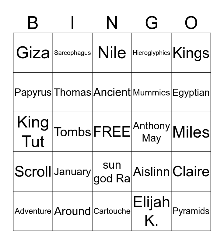 This bingo card has a free space and 24 words: January, Around, Ancient, Adventure, Kings, Giza, Papyrus, Sarcophagus, Anthony May, sun god Ra, Mummies, King Tut, Aislinn, Claire, Thomas, Elijah K., Miles, Nile, Egyptian, Tombs, Pyramids, Scroll, Hieroglyphics and Cartouche.