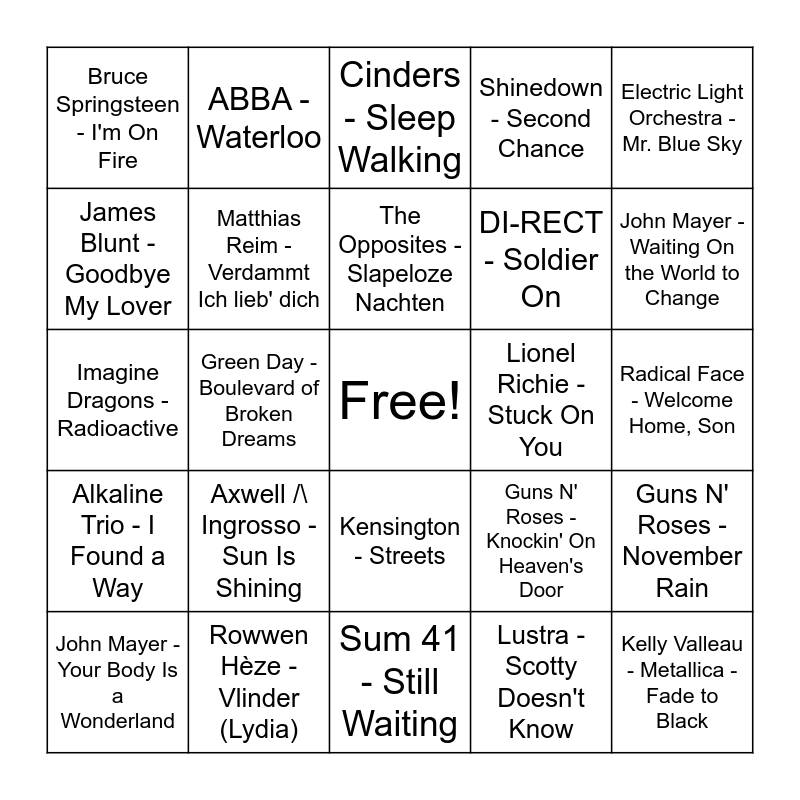 This bingo card has a free space and 24 words: Axwell /\ Ingrosso - Sun Is Shining, Rowwen Hèze - Vlinder (Lydia), The Opposites - Slapeloze Nachten, John Mayer - Your Body Is a Wonderland, Electric Light Orchestra - Mr. Blue Sky, Bruce Springsteen - I'm On Fire, James Blunt - Goodbye My Lover, ABBA - Waterloo, Lionel Richie - Stuck On You, Kensington - Streets, DI-RECT - Soldier On, Imagine Dragons - Radioactive, Guns N' Roses - Knockin' On Heaven's Door, Guns N' Roses - November Rain, Matthias Reim - Verdammt Ich lieb' dich, Lustra - Scotty Doesn't Know, Radical Face - Welcome Home, Son, Cinders - Sleep Walking, John Mayer - Waiting On the World to Change, Green Day - Boulevard of Broken Dreams, Kelly Valleau - Metallica - Fade to Black, Alkaline Trio - I Found a Way, Shinedown - Second Chance and Sum 41 - Still Waiting.
