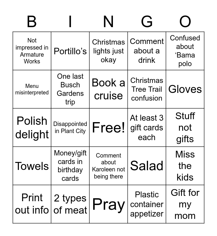 This bingo card has a free space and 29 words: Print out info, Watch ‘Bama game, Disappointed in Plant City, Don’t get Herb Ertlinger reference, Not impressed in Armature Works, Christmas lights just okay, One last Busch Gardens trip, Money/gift cards in birthday cards, At least 3 gift cards each, 2 types of meat, Stuff not gifts, Gift for my mom, Pray, Plastic container appetizer, Gloves, Awkward comment/discussion about next year, Comment about Karoleen not being there, Towels, Confused about ‘Bama polo, Polish delight, Salad, Awkward Bonefish money, Christmas Tree Trail confusion, Menu misinterpreted, Comment about a drink, Portillo’s, Miss the kids, Book a cruise and Money complaint.