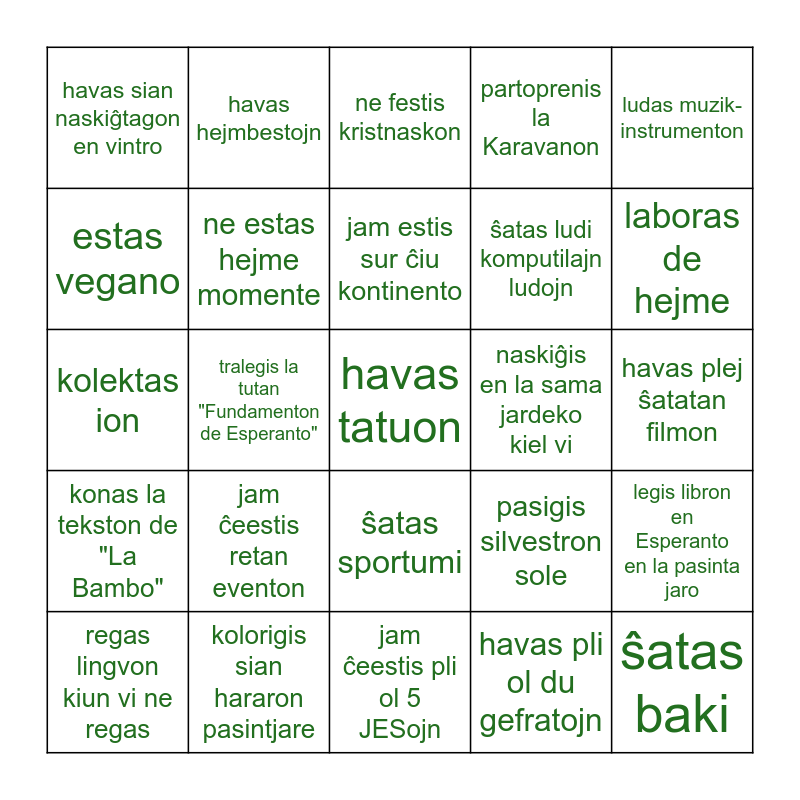 This bingo card has 25 words: jam ĉeestis retan eventon, jam ĉeestis pli ol 5 JESojn, jam estis sur ĉiu kontinento, regas lingvon kiun vi ne regas, ludas muzik-instrumenton, havas sian naskiĝtagon en vintro, estas vegano, havas hejmbestojn, naskiĝis en la sama jardeko kiel vi, ŝatas sportumi, ŝatas ludi komputilajn ludojn, kolektas ion, pasigis silvestron sole, legis libron en Esperanto en la pasinta jaro, ne estas hejme momente, ŝatas baki, havas plej ŝatatan filmon, ne festis kristnaskon, laboras de hejme, tralegis la tutan "Fundamenton de Esperanto", havas tatuon, kolorigis sian hararon pasintjare, konas la tekston de "La Bambo", partoprenis la Karavanon and havas pli ol du gefratojn.