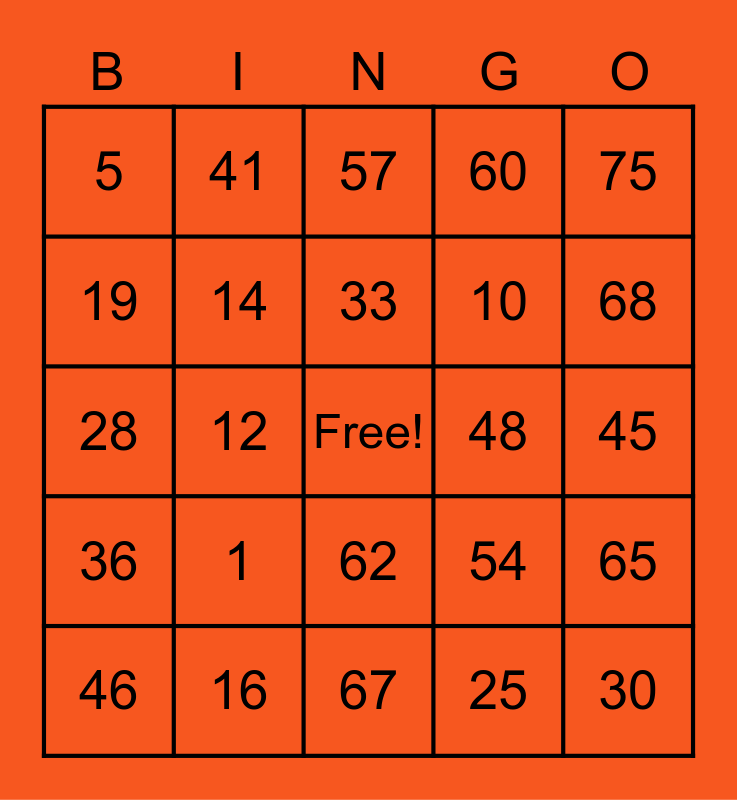 This bingo card has a free space and 24 words: 1, 16, 33, 46, 75, 5, 19, 41, 48, 62, 10, 28, 54, 65, 14, 25, 45, 57, 68, 12, 30, 36, 60 and 67.