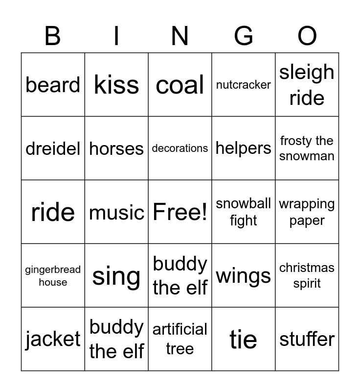 This bingo card has a free space and 25 words: sing, artificial tree, decorations, jacket, sleigh ride, beard, dreidel, kiss, snowball fight, buddy the elf, helpers, ride, wings, christmas spirit, horses, santa's sleigh, wrapping paper, coal, frosty the snowman, music, stuffer, buddy the elf, gingerbread house, nutcracker and tie.