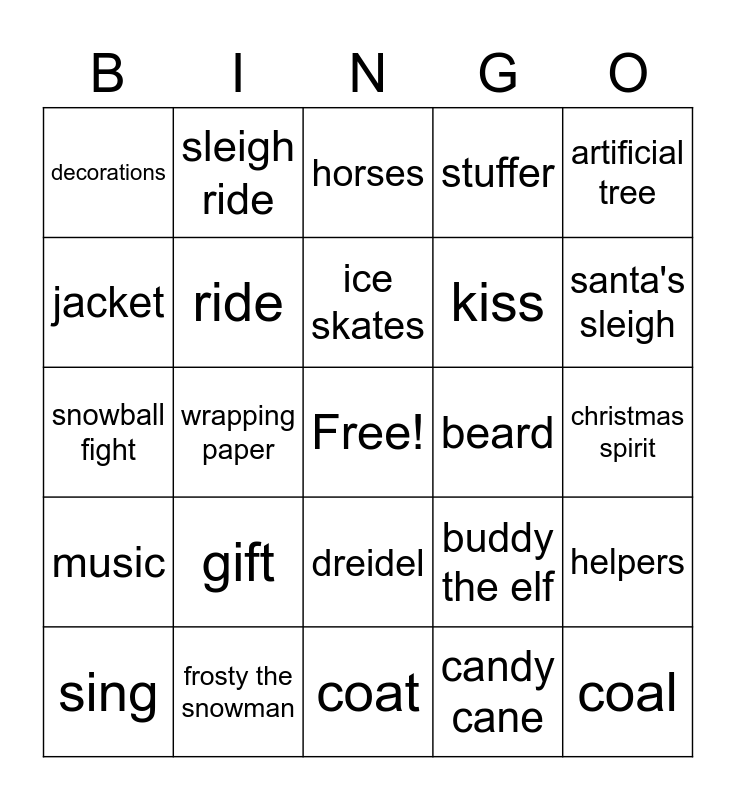 This bingo card has a free space and 25 words: gift, coat, ice skates, sing, artificial tree, decorations, jacket, sleigh ride, beard, dreidel, kiss, snowball fight, buddy the elf, helpers, ride, wings, christmas spirit, horses, santa's sleigh, wrapping paper, coal, frosty the snowman, music, stuffer and candy cane.