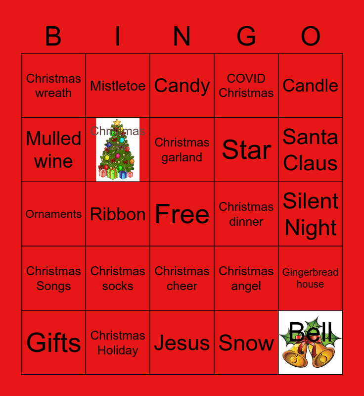This bingo card has 2 images, a free space and 29 words: Reindeer, Christmas Holiday, Candy, Joy to the World, Candle, Christmas wreath, Christmas tree, Christmas garland, Christmas dinner, Gingerbread house, Gifts, Ribbon, Snow, Bell, Ornaments, Christmas lights, Jesus, Christmas angel, Santa Claus, Christmas Songs, Christmas socks, Christmas Cookies, Star, Silent Night, Mulled wine, Mistletoe, Christmas cheer, COVID Christmas and Rudolph.