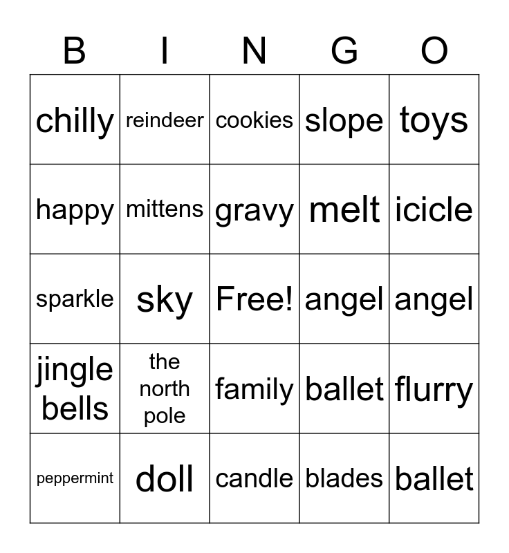 This bingo card has a free space and 25 words: the north pole, candle, gravy, peppermint, toys, chilly, happy, reindeer, angel, family, melt, sparkle, ballet, flurry, mittens, star, angel, cookies, icicle, sky, ballet, doll, jingle bells, slope and blades.