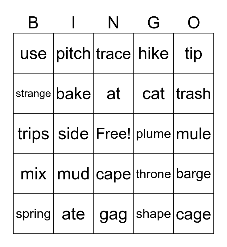 This bingo card has 41 words: grass, trips, still, bake, ate, cape, at, cap, tip, mix, side, hike, Free!, mule, plume, mud, stun, use, place, trace, barge, cage, gag, cat, chop, chin, shape, shut, trash, phone, catch, pitch, spring, scratch, throne, strange, high, tie, cry, light and shy.