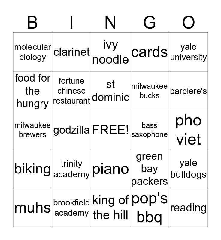 This bingo card has a free space and 24 words: trinity academy, brookfield academy, st dominic, muhs, yale university, molecular biology, food for the hungry, clarinet, bass saxophone, piano, milwaukee bucks, milwaukee brewers, green bay packers, yale bulldogs, fortune chinese restaurant, pop's bbq, pho viet, ivy noodle, barbiere's, godzilla, reading, biking, cards and king of the hill.
